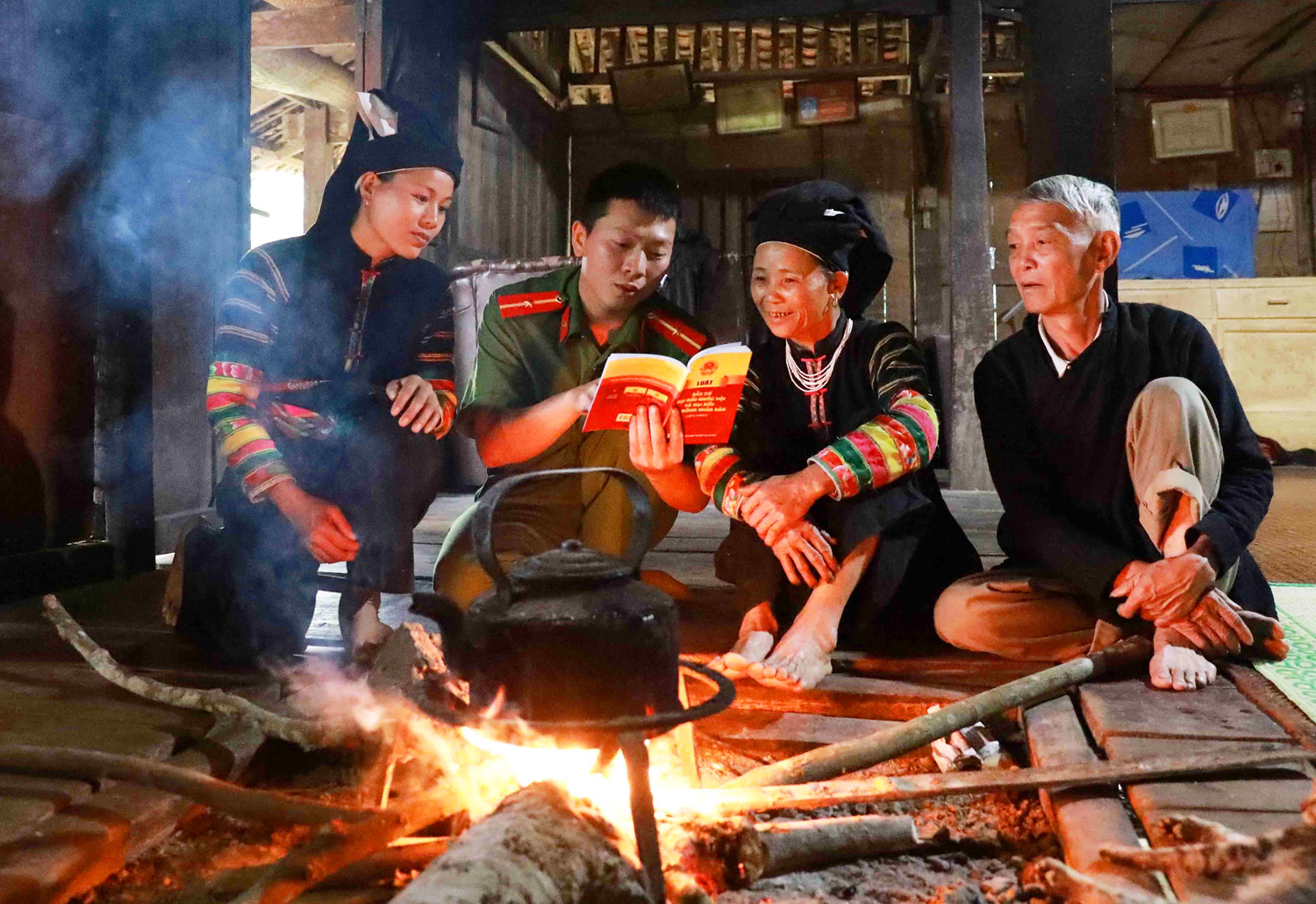 | Cán bộ, chiến sĩ công an nhân dân phổ biến về Luật Bầu cử đại biểu Quốc hội khóa XV và hội đồng nhân dân các cấp nhiệm kỳ 2021 - 2026 cho đồng bào tại xã Kim Cúc, huyện Bảo Lạc, tỉnh Cao Bằng _Ảnh: Tư liệu |