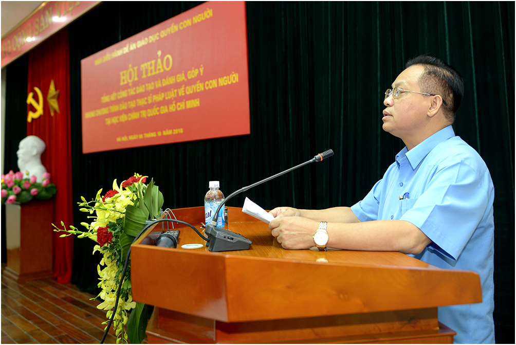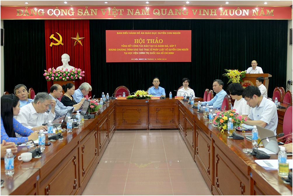 Trong khuôn khổ đề án Đưa nội dung quyền con người vào chương trình giáo dục trong hệ thống giáo dục quốc dân, ngày 5/10/2018, được sự đồng ý của Giám đốc Học viện, Ban Điều hành Đề án đã phối hợp với các đơn vị chức năng của Học viện tổ chức Hội thảo khoa học “Tổng kết công tác đào tạo và đánh giá, góp ý cho khung chương trình đào tạo thạc sĩ Pháp luật về quyền con người”.