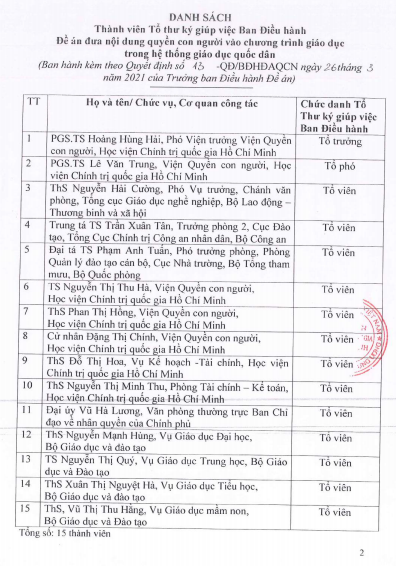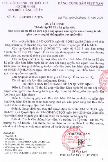 Quyết định Thành lập Tổ thư ký giúp việc Ban Điều hành Đề án đưa nội dung quyền con người vào chương trình giáo dục trong hệ thống giáo dục quốc dân